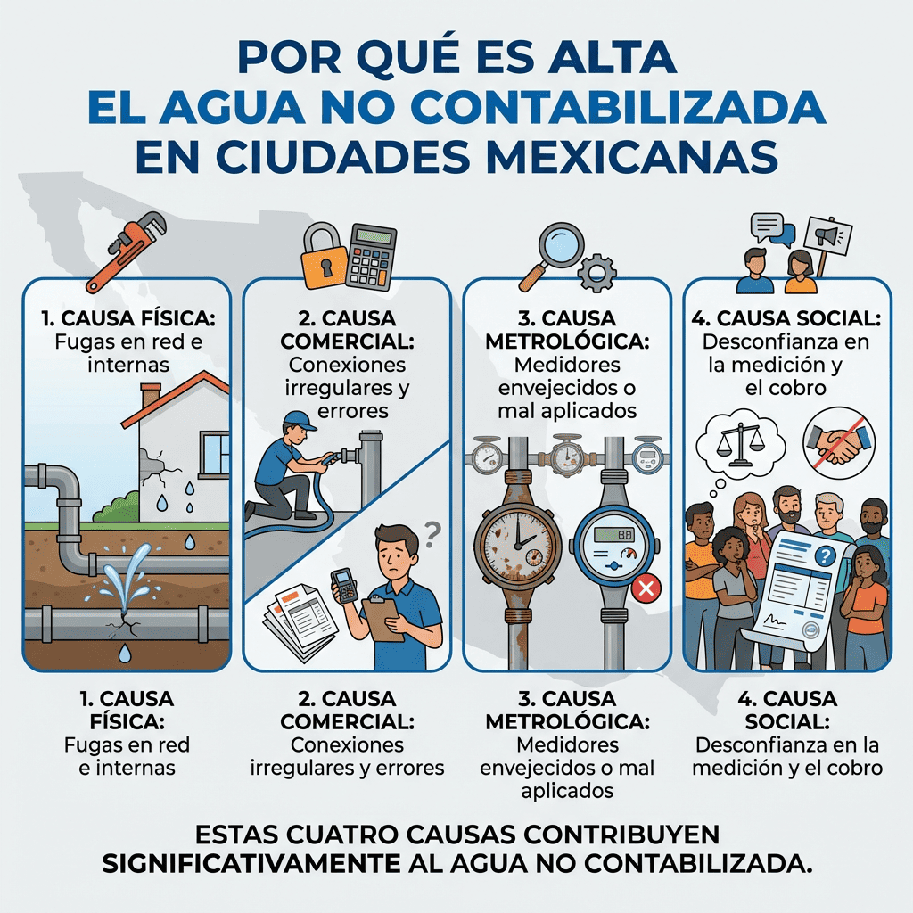 Yo veo cuatro causas muy claras. La primera es física: fugas en red y en instalaciones internas. La segunda es comercial: conexiones irregulares, errores de lectura y estimaciones. La tercera es metrológica: medidores envejecidos o mal aplicados. La cuarta es social: una parte de los usuarios siente que medir no siempre significa cobrar de forma justa.