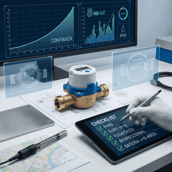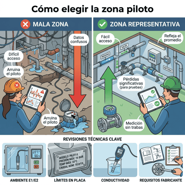 Un buen piloto elige una zona representativa, fija KPIs claros, usa medidores ultrasónicos R400 con arranque 0.001 m³/h, IP68 y NB‑IoT/M‑Bus, valida condiciones de uso, ambiente E1/E2 y límites de presión antes de escalar.