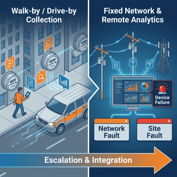 | AMR walk‑by | RF / M‑Bus | Alarmas y estados | |