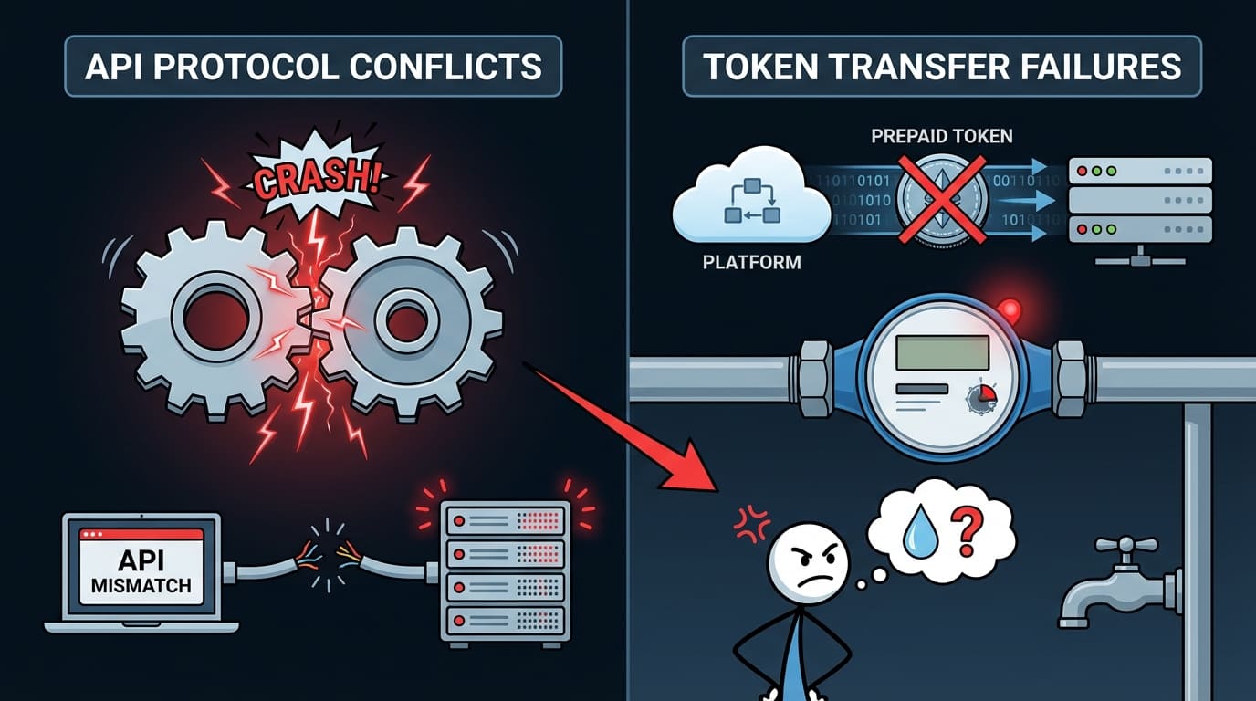 API mismatches crash software integrations. Prepaid tokens fail to reach the meter. Customers lose water and get angry. I use early sandbox tests to avoid this.