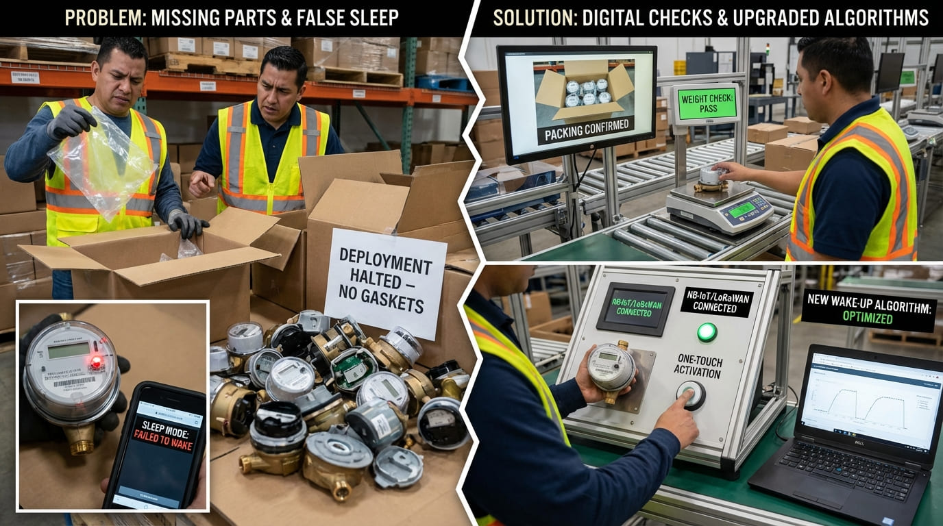 I stop missing parts with digital weight checks and packing photos. To fix false sleep modes, I upgrade the NB-IoT and LoRaWAN wake-up algorithm and add a simple one-touch activation test.