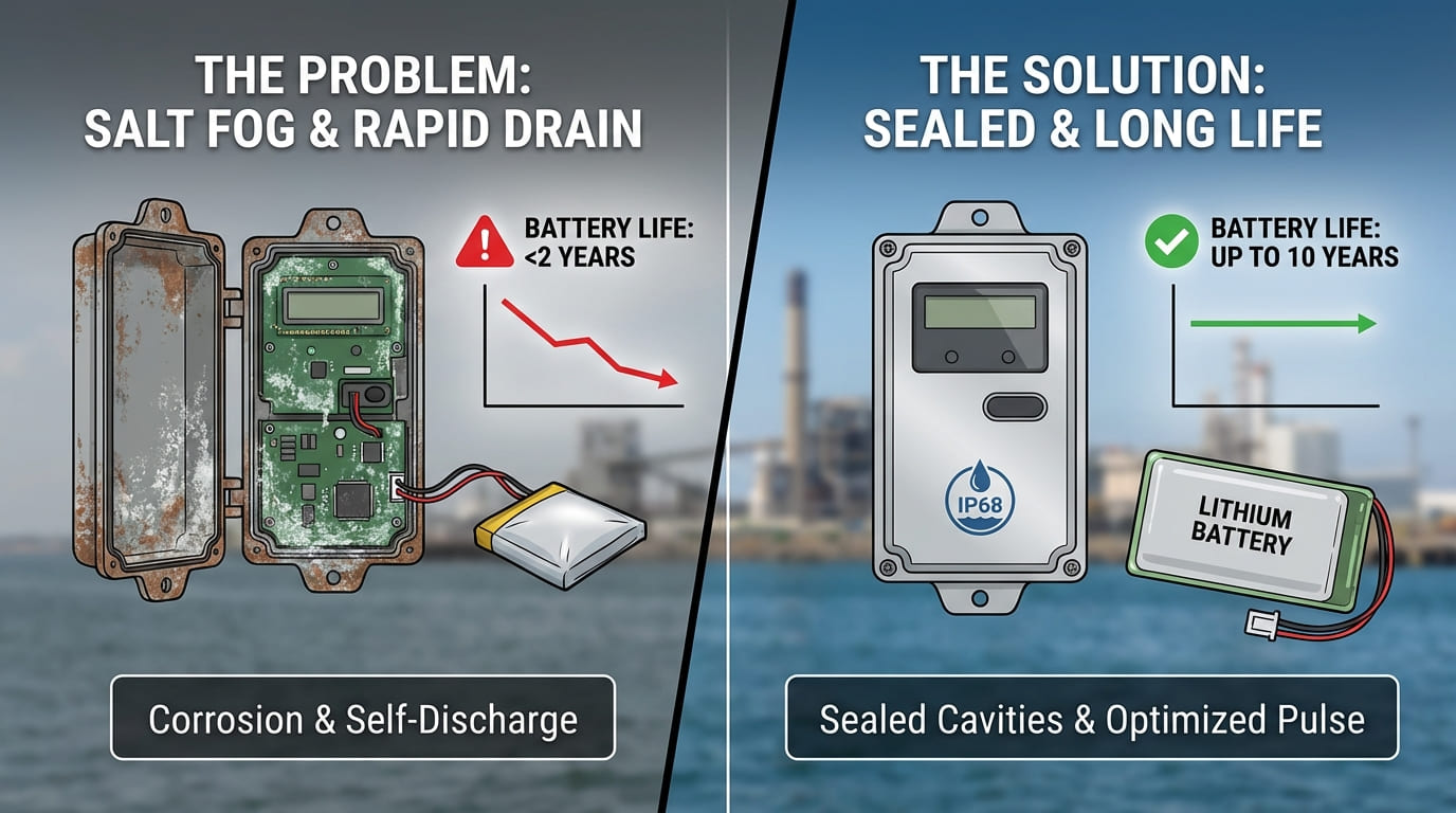 Salt air destroys meter bodies. Fast self-discharge kills batteries in two years. You face massive replacement costs. I use sealed cavities and large batteries to prevent this.