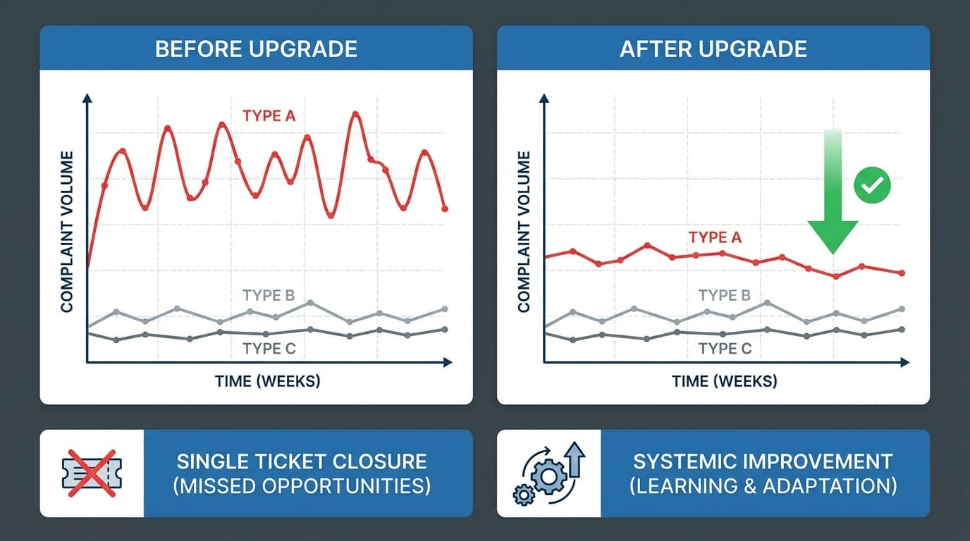 A complaint curve can teach more than a single report. I lose improvement chances when I only close tickets one by one.
