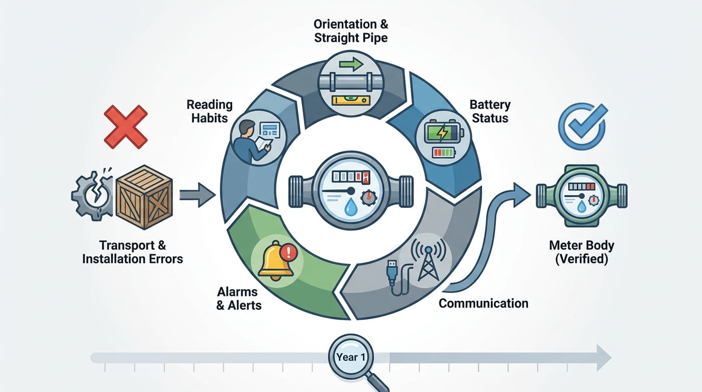 I treat first-year complaints as early-life signals. I check installation direction, straight pipe sections, battery status, communication, alarms, and customer reading habits before I judge the meter body itself.