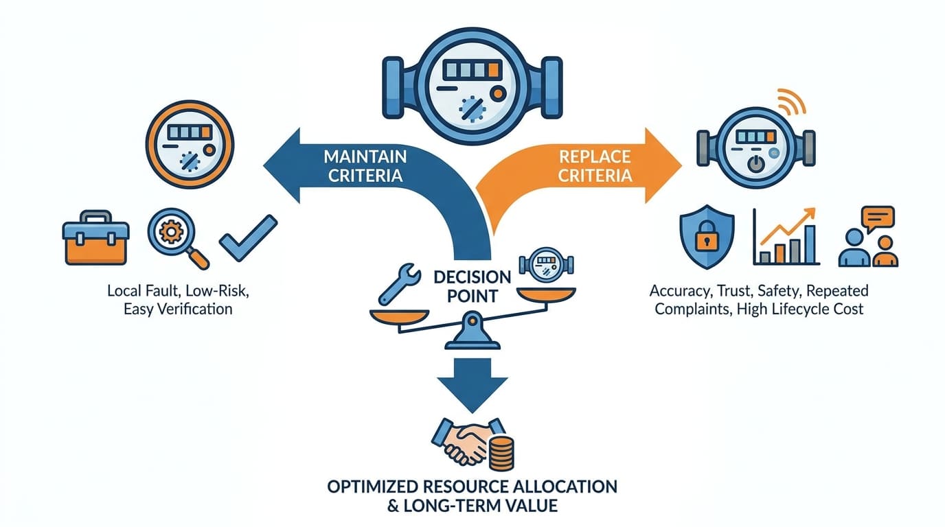 I maintain a meter when the fault is local, low-risk, and easy to verify. I replace it when accuracy, trust, safety, repeated complaints, or lifecycle cost becomes unacceptable.