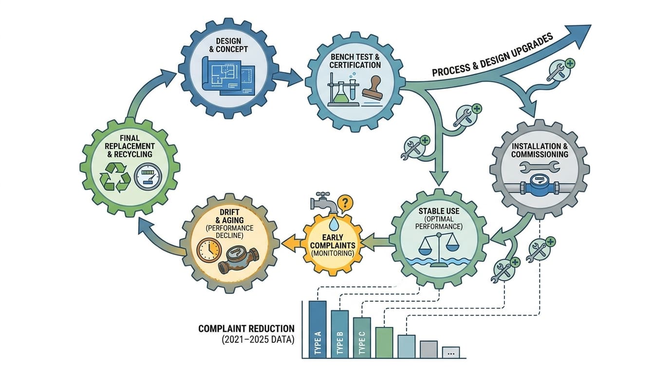 I manage water meter lifecycle replacement by tracking each meter from design, bench test, certification, installation, early complaints, stable use, drift, aging, and final replacement. My 2021–2025 complaint data shows that each process or design upgrade can reduce a clear complaint type.