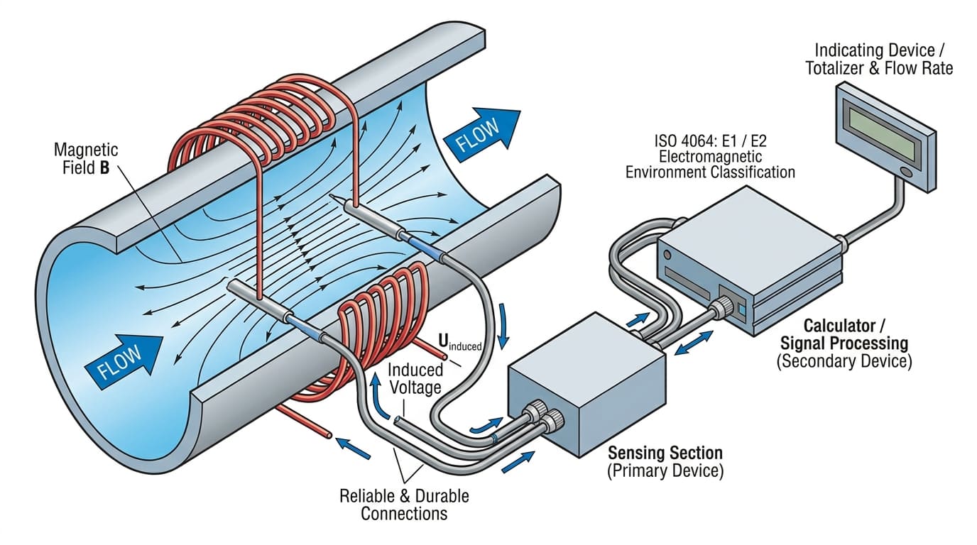 Electromagnetic water meters measure flow using an electronic measurement system built around the sensing section and electronic components. In ISO 4064 language, these meters can include separate primary and secondary devices, and the connections between the measurement transducer, 計算機, and indicating device must be reliable and durable. The same reliability requirement also applies to the connections between the primary and secondary devices of electromagnetic meters.