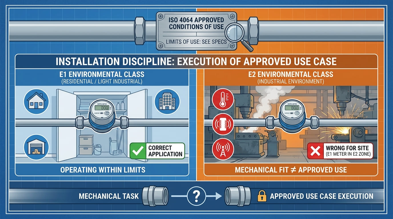 Installation discipline matters more than many teams admit. ISO 4064 requires manufacturers to inform users of the approved conditions of use, and the data plate shall show the corresponding limits of use. That means installation is not just a mechanical task. It is the execution of the approved use case.