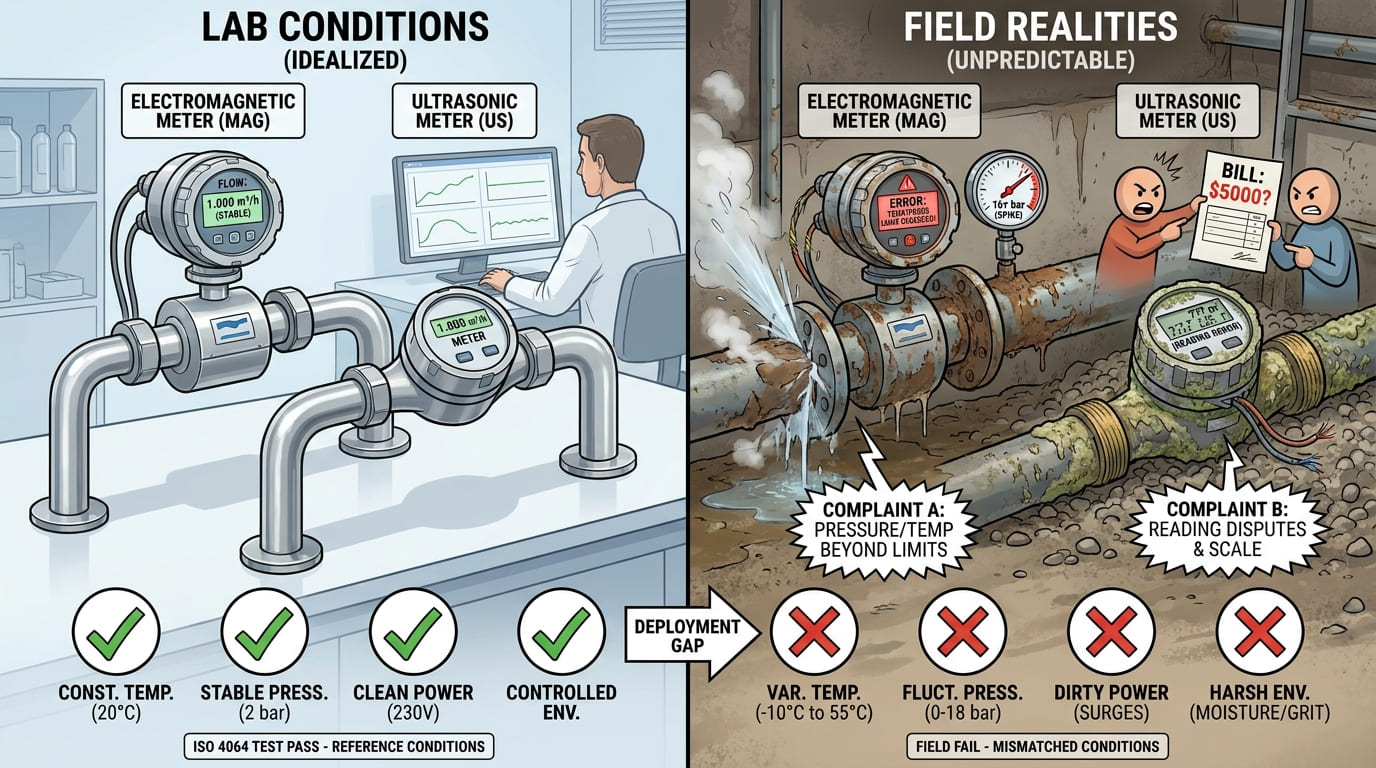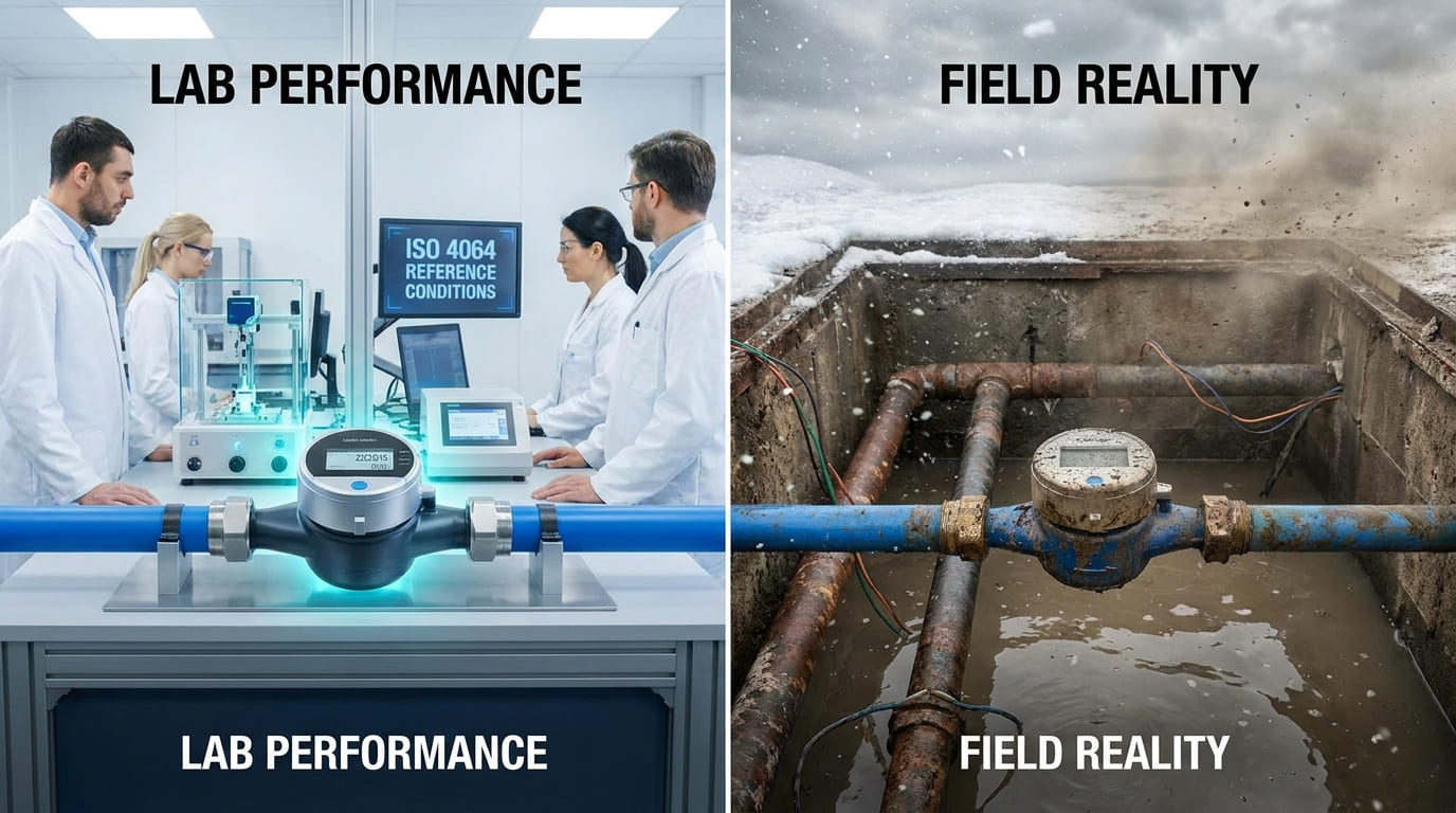 Lab performance is necessary, but it is not the same as field reality. ISO 4064 itself makes this clear because it defines reference conditions, environmental testing, electromagnetic classes, and power supply tests for electronic water meters.