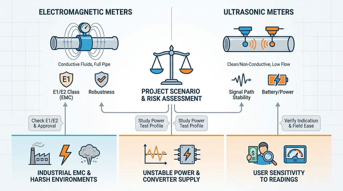 I think this is where many project teams go wrong. They compare technologies as if “electromagnetic” and “ultrasonic” each behave the same everywhere. They do not. What matters in real projects is not only how the technology works, but also how the meter is installed, what environment class it was approved for, and whether the local network pushes it outside those limits.
